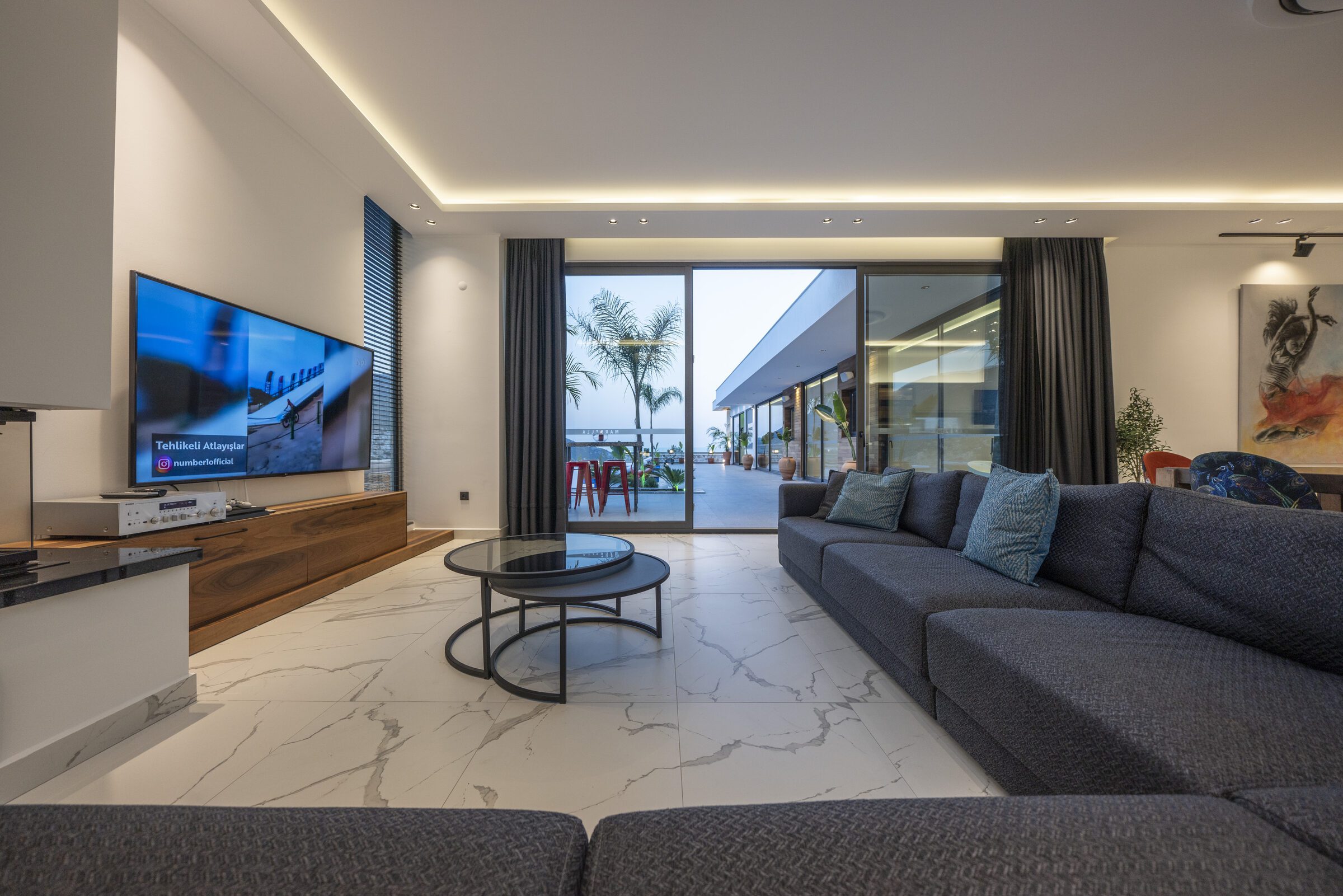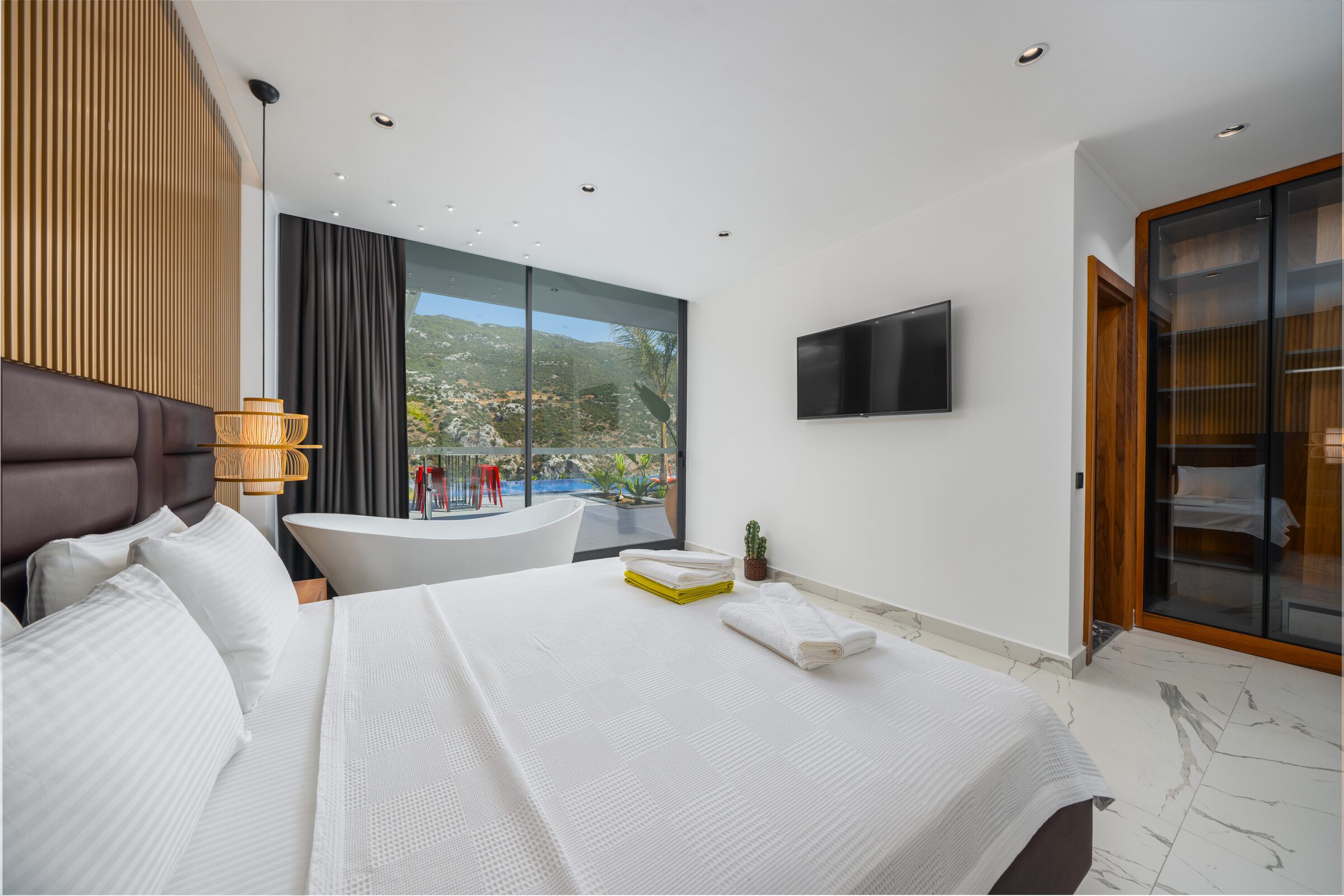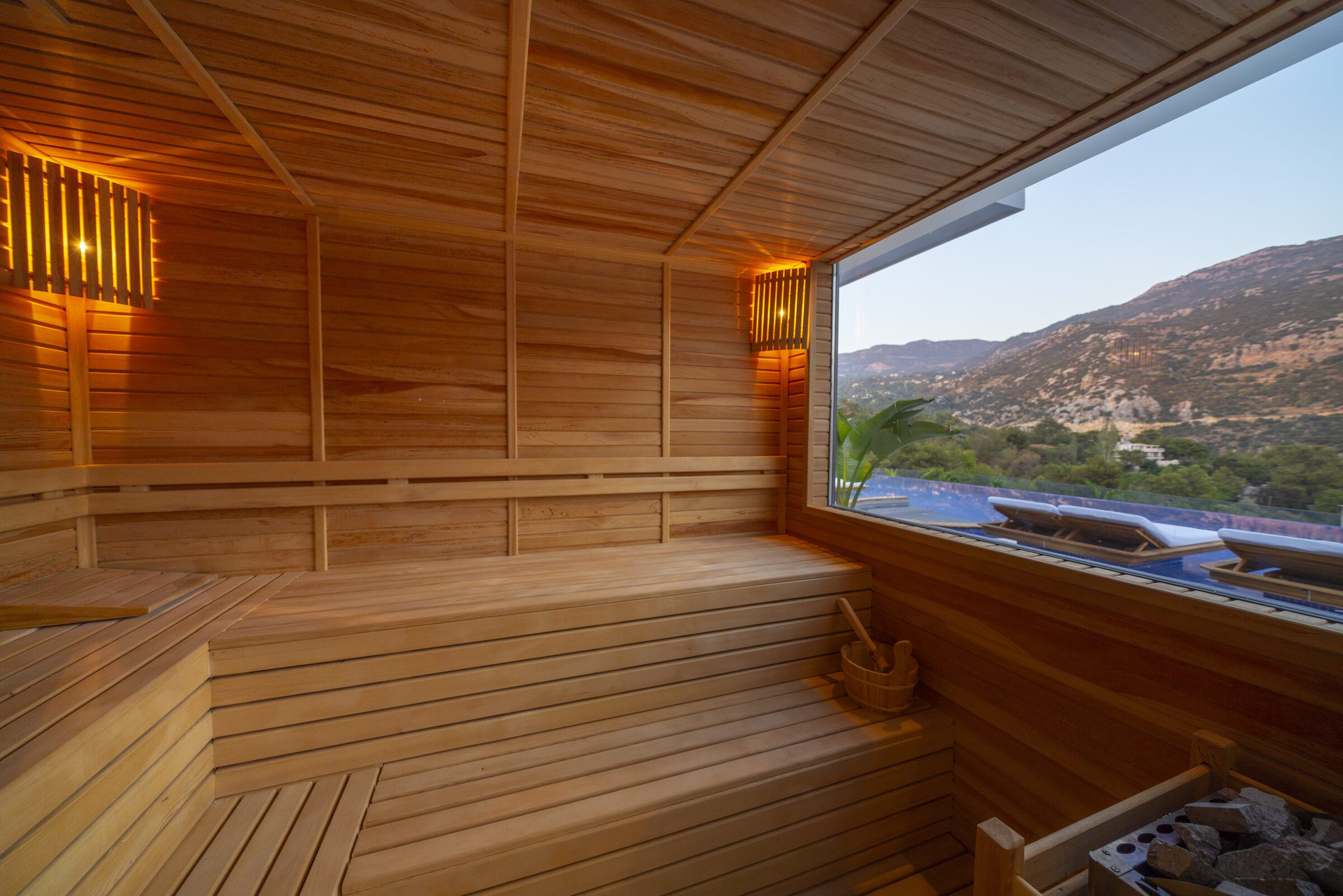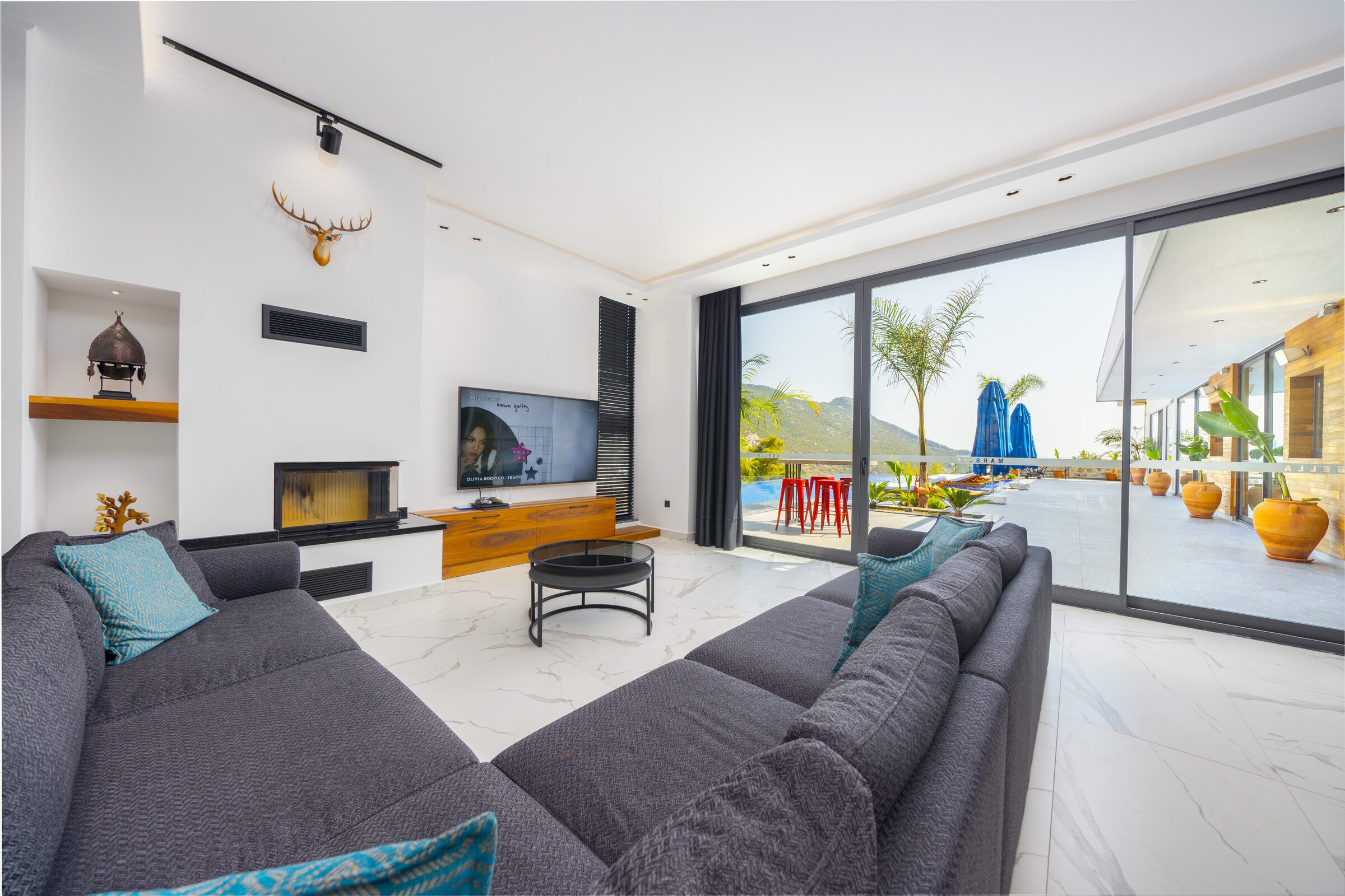 Inside, Villa Sade offers spacious, modern interiors finished to a very high standard. The open-plan living areas are elegant yet comfortable, flowing seamlessly out onto the terrace and pool area, making indoor and outdoor living effortless. The villa also benefits from outstanding private wellness facilities, including a gym, sauna and traditional hamam, adding an extra level of indulgence to the stay.
